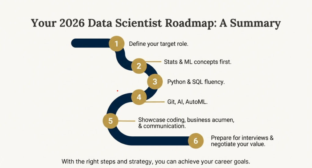 In order to master advanced AI tools and business strategy by 2026, one must first master foundational mathematics. It is a field that requires continuous learning, especially with the incorporation of generative AI and MLOps into standard workflows. Students can succeed in this highly competitive field by building a strong portfolio and honing both technical and “human” skills like communication and negotiation. Ultimately, learner’s ability to apply these skills through real-world projects and refine your interview and negotiation techniques will be the deciding factors in securing a high-value role in this evolving industry