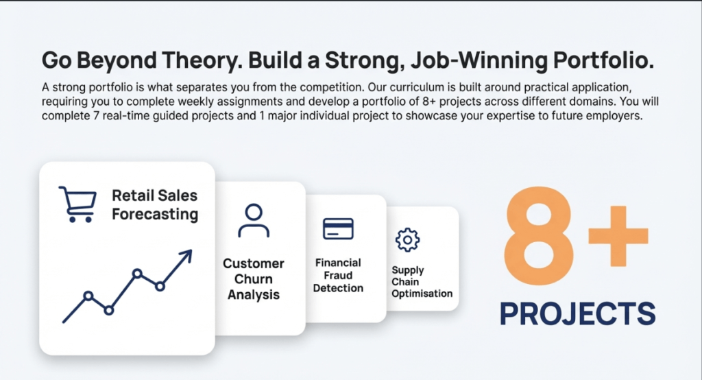Building a professional portfolio mastery is demonstrated through application. WhiteScholars helps students build a strong portfolio by requiring them to complete eight projects in various domains. For those on the Data Analytics track, this includes 7+ real-time projects and one individual project. These projects enable students to demonstrate their ability to solve “real-world” problems, which is a key component of the WhiteScholars mission.