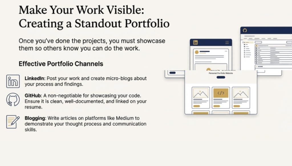 Once students have learned skills, they must demonstrate them. This entails developing real-world projects with platforms like Kaggle or personal data, such as credit card spending patterns. These projects should be showcased in a comprehensive portfolio that includes a personal website, a GitHub profile, micro-blogs on Medium, and a professional LinkedIn presence.