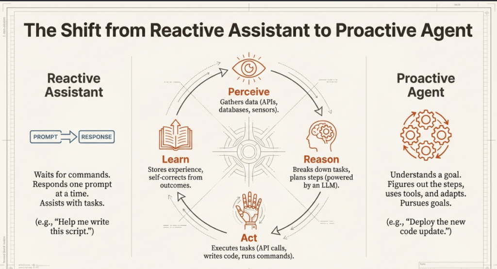 Traditional assistants are reactive, waiting for human prompts to provide a single response, whereas agentic AI is proactive, assuming a goal and pursuing it. It perceives its surroundings, thinks through complex tasks, and uses tools independently to adapt and achieve goals with little human intervention. Essentially, it acts, adapts, and learns through its own operational cycles, rather than simply providing assistance.