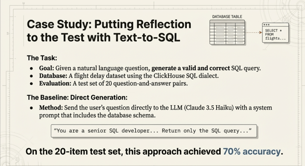 1. Simple Reflection (Self-Critique): At this stage, the model was asked to evaluate its own generated SQL and suggest improvements. Surprisingly, this did not significantly improve quality, as the accuracy rate remained at 70%.