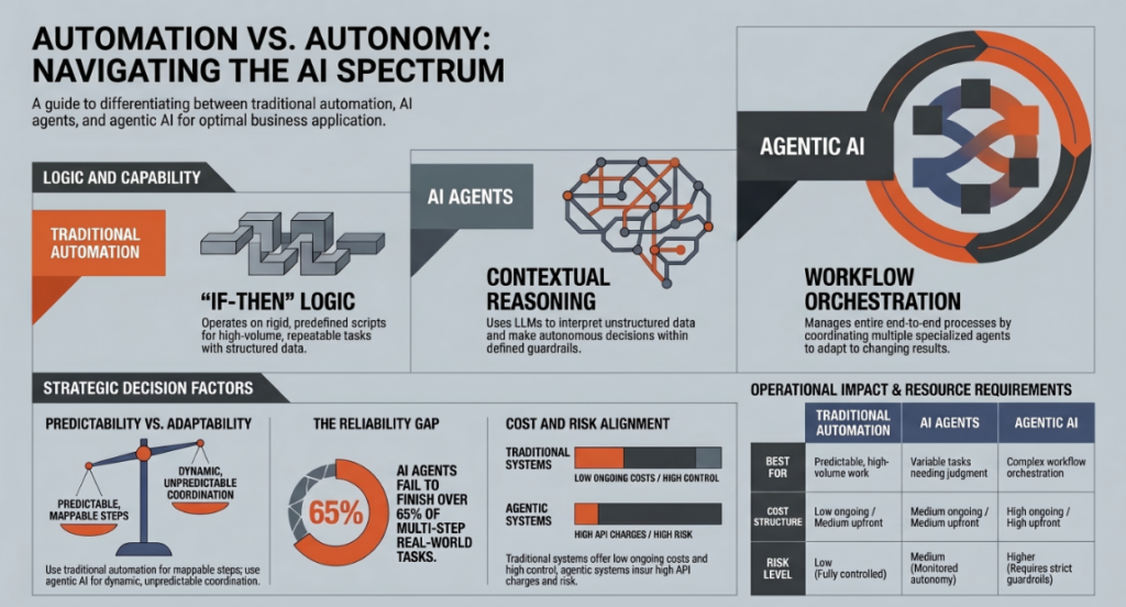 Choosing between traditional automation, AI agents, and agentic AI depends on the predictability of the task and the level of judgement required.