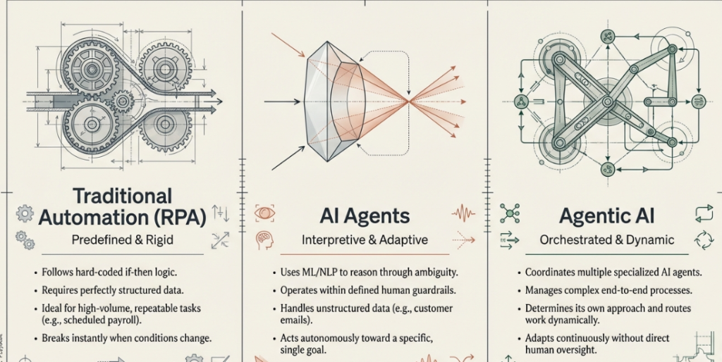 - Traditional Automation: Rigid “if-then” logic for predictable, high-volume tasks.