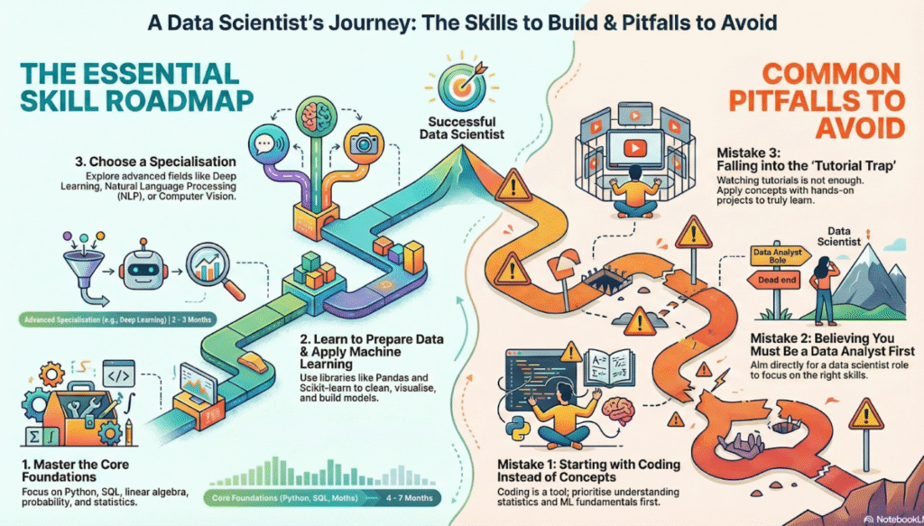 Data science is fundamentally rooted in statistics and machine learning, with coding serving strictly as a tool for application. While powerful programming languages such as Python, SQL, and R must be learnt, the critical mistake is to begin coding before mastering the fundamental concepts of statistics, machine learning, and mathematics.