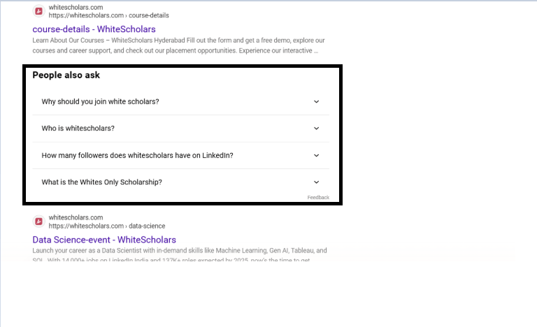 I searched for White Scholars, a digital marketing, data science, and data analytics training institute in Hyderabad, and all of the frequently asked questions about White Scholars appear in the ‘People also ask’ section.