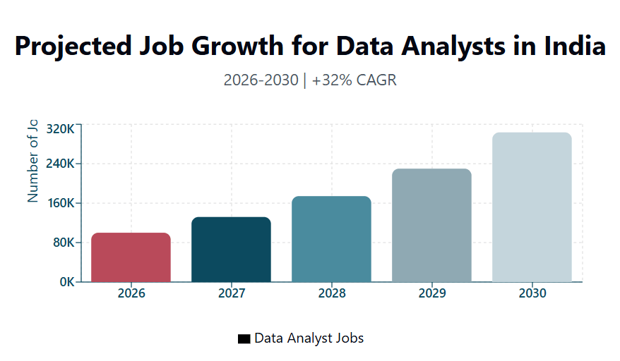 According to NASSCOM, by 2026, India will need 1.3 million data professionals, and the demand for data analyst jobs is growing at nearly 27% for freshers every year.