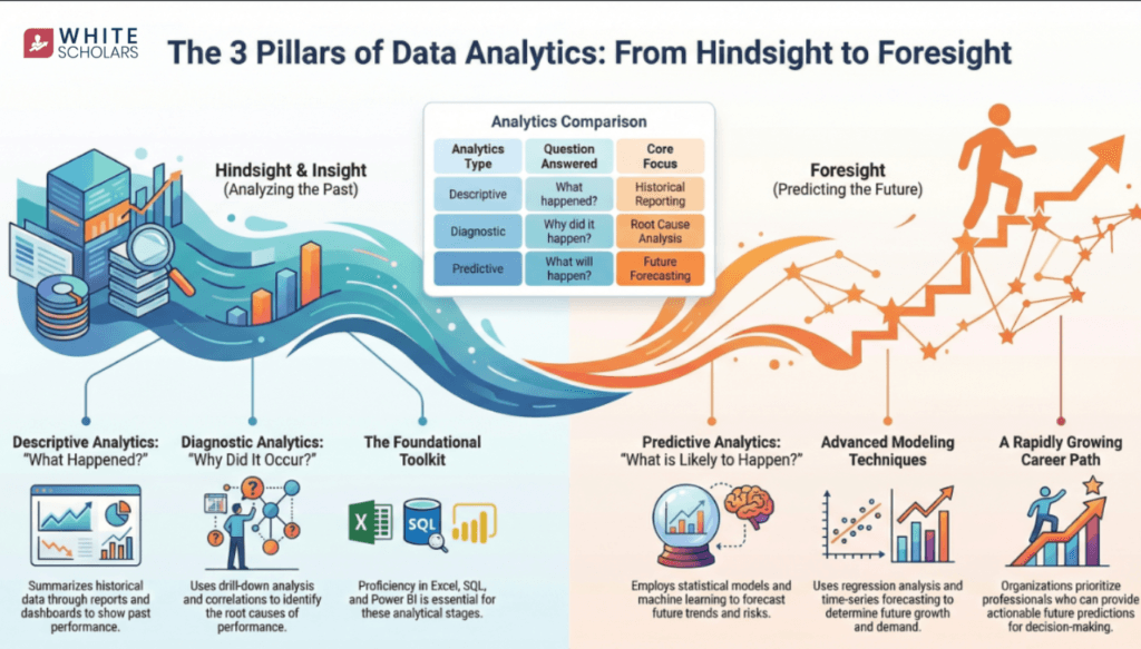 If you are a fresher planning to build a career in data analytics, you must clearly understand the difference between these three: descriptive, Diagnostic, and predictive analytics. These three are the building blocks of modern business intelligence.