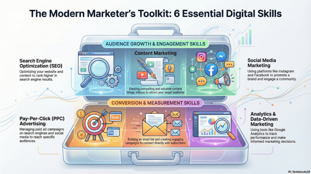Digital marketing requires a diverse blend of technical, creative, and analytical skills. These can be divided into two categories: core technical channels (the specific methods used to reach audiences) and operational strategic skills (required to manage campaigns or run a successful agency).