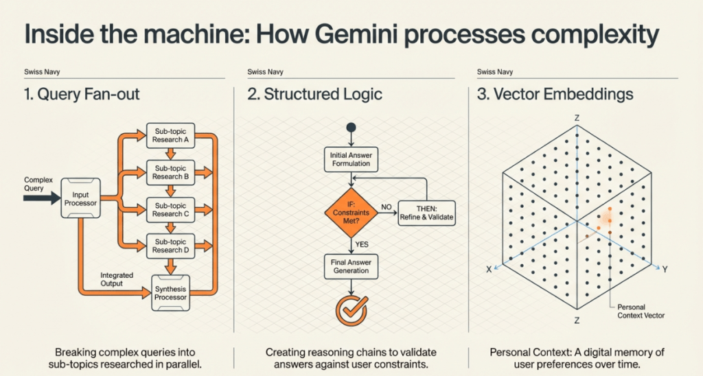 1. Query Fan-out Technique: The AI breaks a complex query into multiple subtopics and researches them simultaneously. It then synthesises these parallel research points into one cohesive answer.