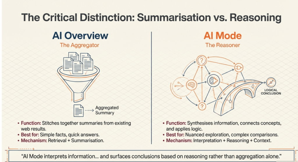 While they appear similar, AI Overviews and AI Mode serve different purposes based on the complexity of the user’s intent.