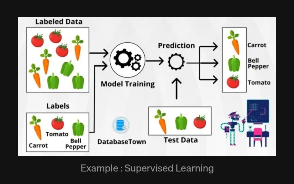 In Supervised Learning, models train on labeled data to map inputs to outputs; for instance, labeling vegetable images (e.g., tomato, carrot) teaches a system to
