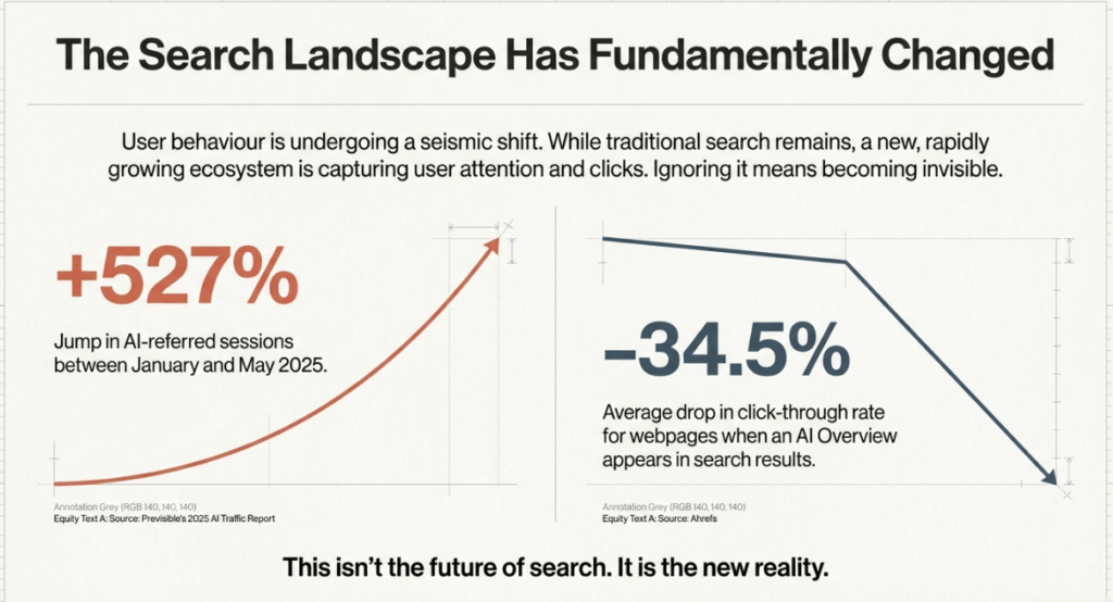 Furthermore, when an AI Overview appears, the average CTR for the top organic results drops by 34.5%. In this environment, “owning the answer” becomes more valuable than merely ranking for a keyword.