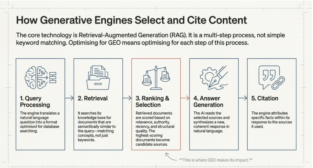 - Ranking and Selection: Retrieved documents are scored based on authority, recency, relevance, and structural quality. This is the stage where GEO-optimized content gains an advantage.