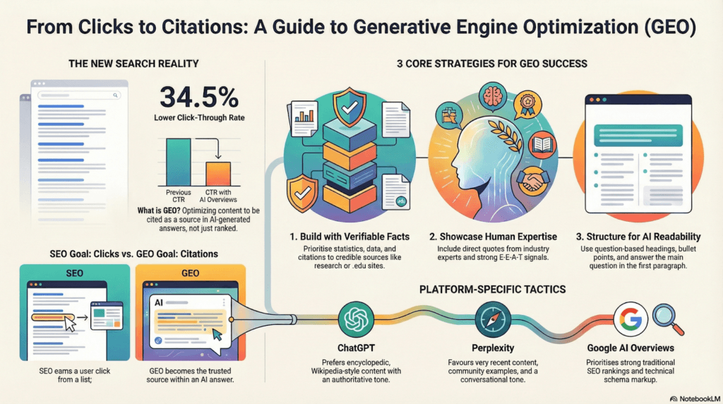 Generative Engine Optimization (GEO) adapts content for AI tools like ChatGPT. Unlike SEO, it focuses on citations rather than clicks. Key strategies include authoritative citations, expert quotes, and high fact density (one statistic per 150-200 words).