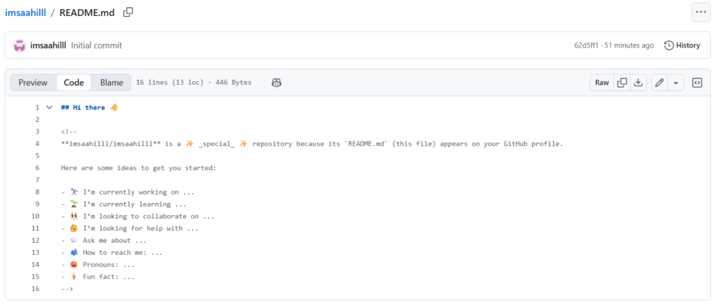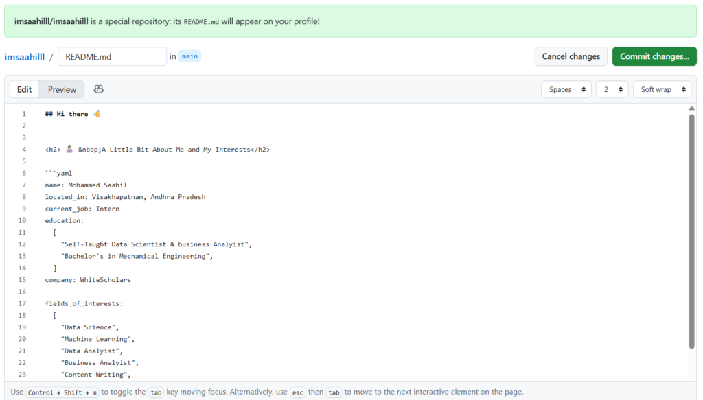 This is the section that I was talking about earlier where most developers use the template shown above. If you want to make your profile stand out, then I would suggest changing the design aspects of this section as well. I went ahead and used YAML format while editing the readme so that the information reads like code when you preview the profile.