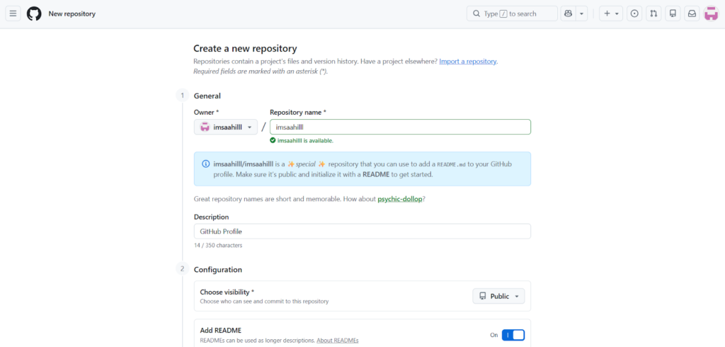 To start designing your GitHub profile, we first have to create a new public repository. Click the “+” icon at the top right and choose “New Repository”. After that comes the critical step, make sure that the name of the repo is the same as your username. Refer to the example below: