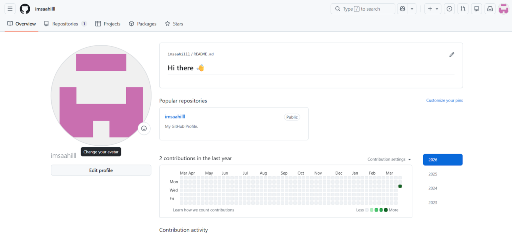 Well done! The repository should now be generated with a simple greeting message in the README.md file. If you navigate to your profile, you should now see this message displayed.