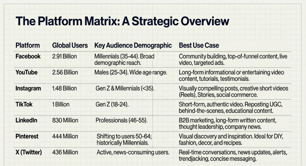 Choosing the right platform is determined by where a specific audience is active and the type of content being shared.