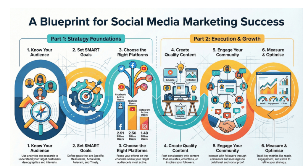 First, you must research your audience and set SMART goals: Specific, Measurable, Achievable, Relevant, and Timely. You should then create engaging, original content and use a calendar to ensure you are posting consistently. Finally, in order to optimize your future efforts, you must regularly measure your results using key performance indicators such as engagement and reach.