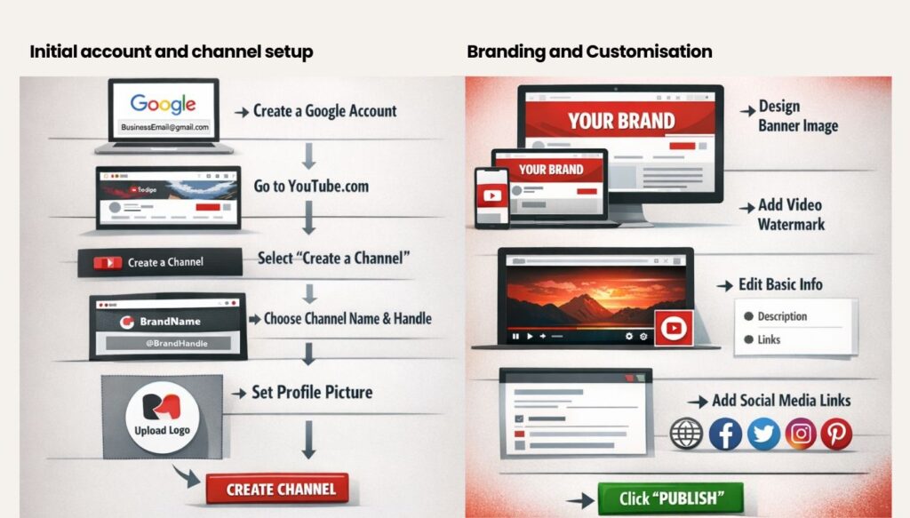 A comprehensive technical guide detailing the sequential steps to create, brand, and configure a YouTube channel for businesses using official Google tools