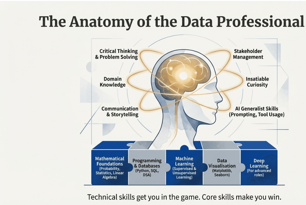 • Mathematics: Strong foundations in linear algebra (for machine learning models), probability (for likelihood-based predictions), statistics (descriptive and inferential), and calculus (for model error minimisation).