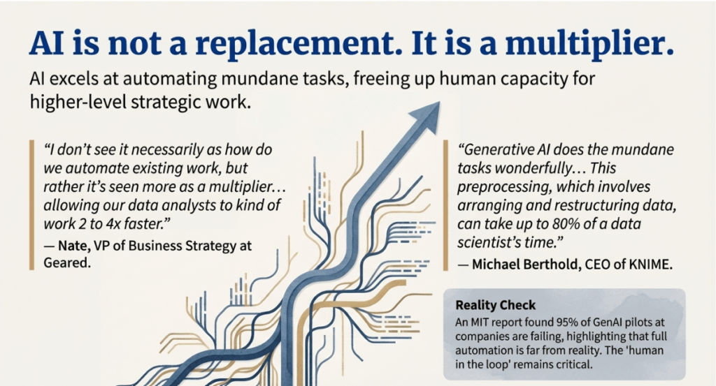 AI functions more as a “multiplier” than a replacement, allowing professionals to work two to four times faster. While it automates routine tasks, humans are required to manage data “pipes” and ensure that results are logically correct. Large Language Models (LLMs) frequently “fall flat on their face” when tasked with generating entirely new insights or unique business knowledge. As a result, having a “human in the loop” is still required to detect illogical outcomes or AI hallucinations.