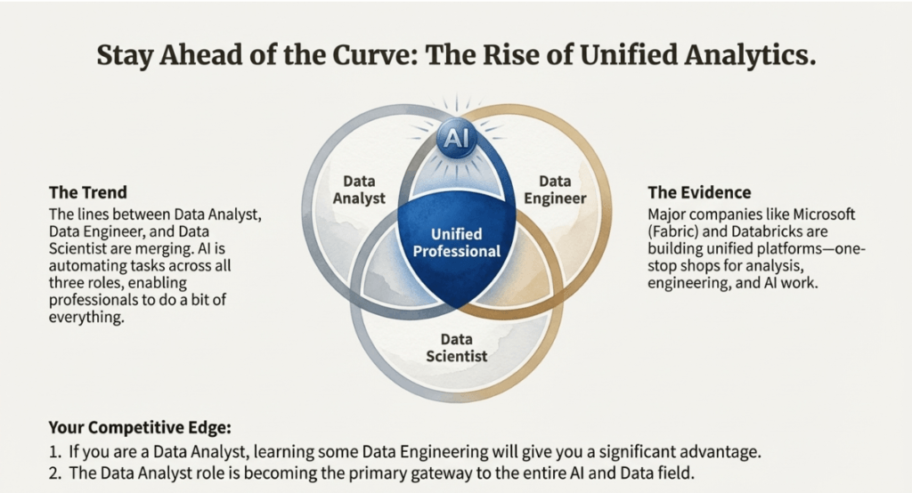 Data Engineer: Concentrates on the “pipes” or infrastructure of data; this role is increasingly merging with analysis to create unified analytics professionals.