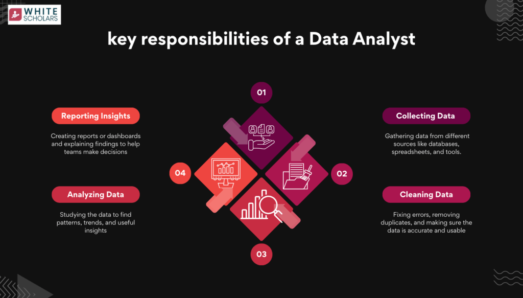 Data analysts are responsible for gathering data from various sources, cleaning the data to eliminate errors, analyzing trends, and then using the results to create reports and dashboards. These results are then used by organizations to improve the performances, cut costs, and explore opportunities for growth. For example, in the e-commerce industry, data analysis is used to analyze purchase history to enhance customer retention. In the medical field, patient information is analyzed to increase treatment outcomes.