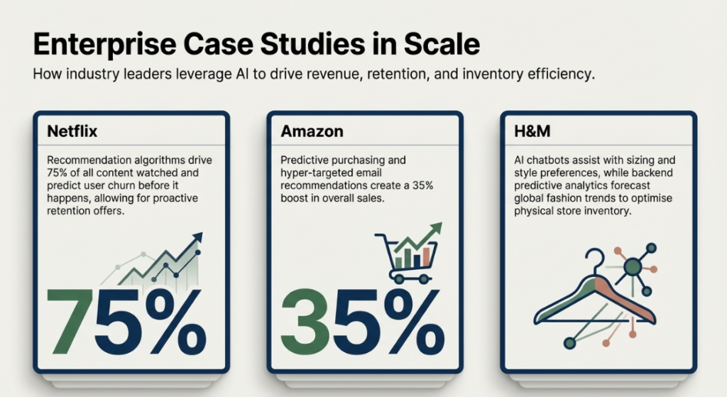 - Amazon: Leverages AI for “anticipatory shipping” and personalised email campaigns that suggest products based on real-time trending data.
