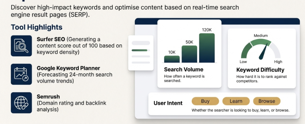 - Align Content with Search Intent: Use keyword research tools like Surfer SEO or Google Keyword Planner to determine if a user’s intent is to “buy”, “learn”, or “browse”. AEO success depends on your content providing the exact “answer” that matches that specific intent.